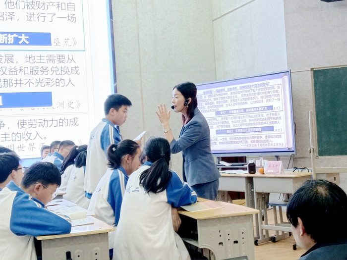 首先,由舒城二中的刘宜照老师进行《西欧经济和社会的发展》的公开课教学活动。刘老师的课分为“欧洲农村之变”“欧洲手工业之变”“欧洲社会结构之变”三个部分,教学思路清晰,史料呈现详实,课件制作美观,教学氛围活跃。接着,由合肥市育英中学历史教研组长、合肥市骨干教师孟玉珍老师执教同课。孟老师以“追梦人——约翰、杰克、内德三人的追梦故事”为框架,以“青年逐梦”“晚年忆梦”两个篇章,将教材知识加以精心整合,把抽象的历史结论巧妙的融入活动情境之中,以“追梦人”的人生经历来呈现历史史实。整个教学设计生动有趣,重视史料探究,师生互动积极,彰显了省级名师高超的教学水平。