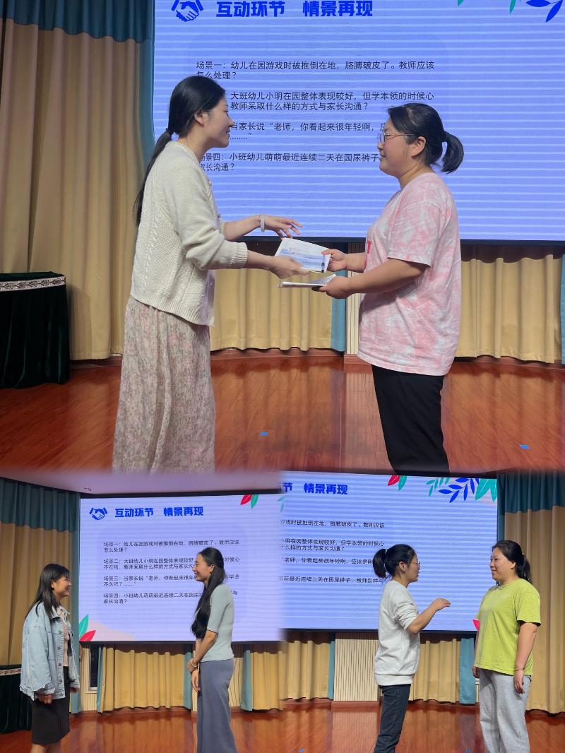 活动中,程主任围绕开展家园共育工作的四个方面:“教师和家长相处的基本原则”、“教师对家长的态度”、“与家长沟通过交流时注意的方面”和“教师与家长沟通的策略”展开分享。为了更有效地将家园共育沟通技巧运用到实际之中,老师们通过“互动环节”情境再现了教师与家长日常沟通中可能会出现的问题。