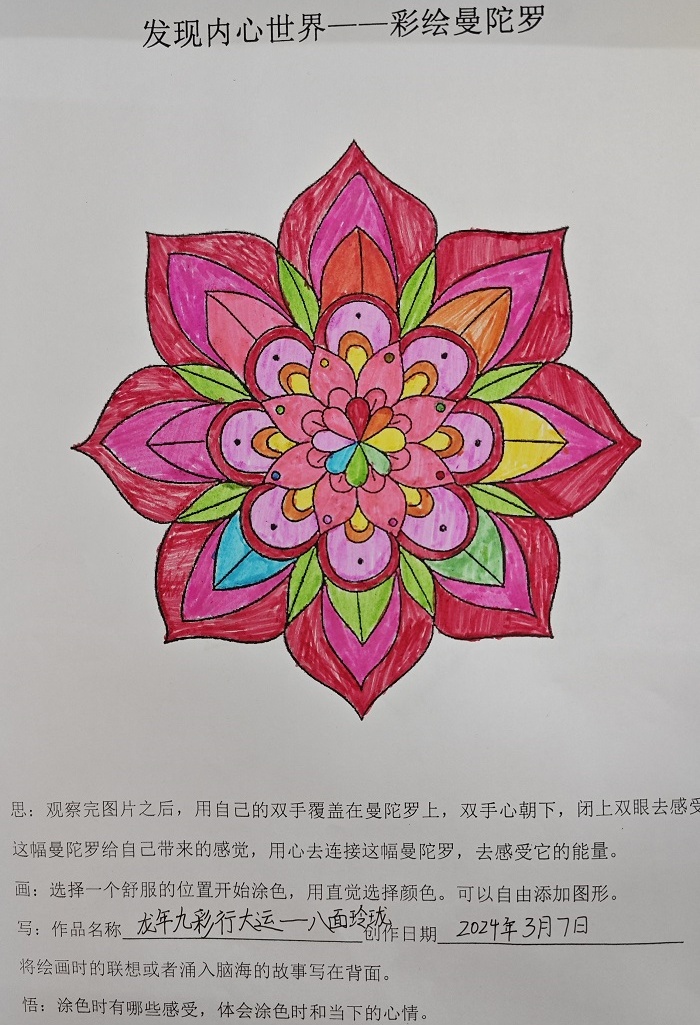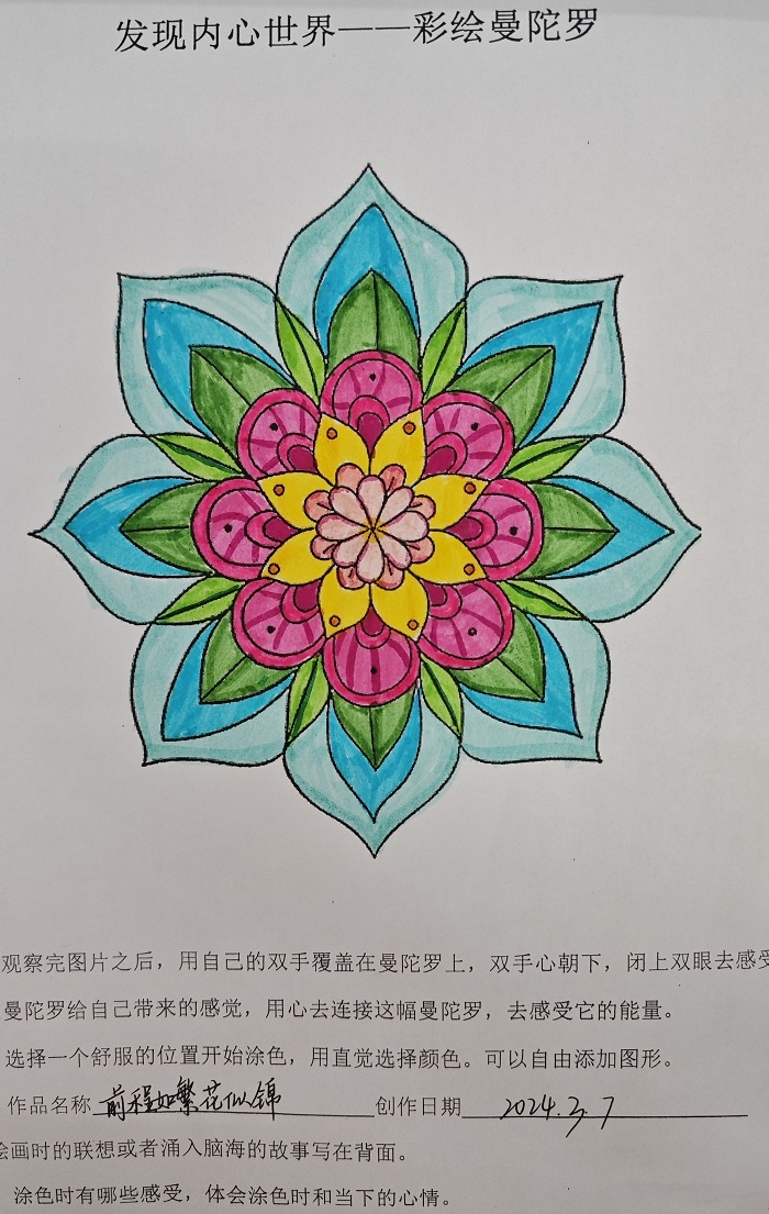 通过笔尖和纸张的摩擦,激发出同学们内心的秩序感,一些或积极向上或忧伤愤懑或迷茫无措的情绪慢慢流淌出来。互相诉听着彼此的心灵故事,欣赏着自己的彩绘作品,积极的感觉得到加强,忧伤的体验慢慢被治愈,而迷茫无措也开始被看见。一种互助互爱,自助自强的情感在同学们心中流淌,无声的滋润着同学们的心田。(方雅婷 特约通讯员:汤新生)