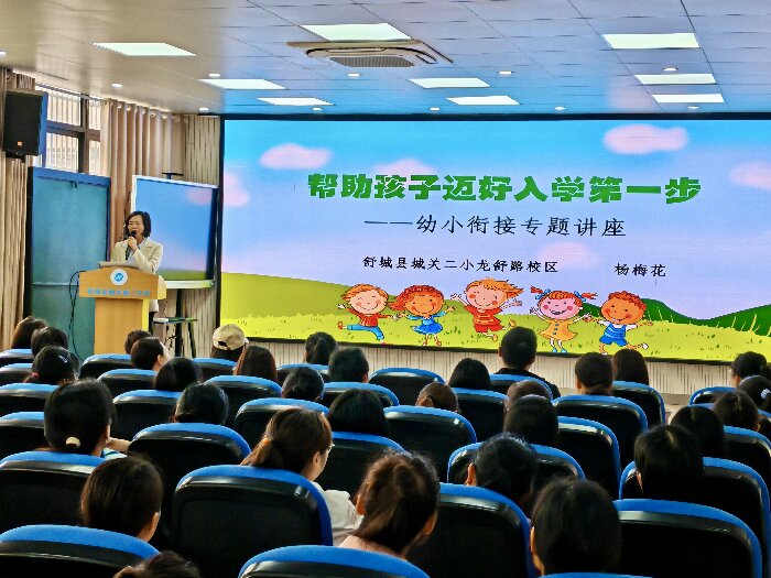 首先,在校多功能厅举行简短而热烈的欢迎仪式,龙舒路校区校长杜成蹊对二个幼儿园的老师、小朋友及家长的到来表示热烈欢迎,并介绍了校区的基本情况、校园文化、办学理念及未来发展规划。接着县直机关幼儿园园长对学校的热情接待表示感谢,并阐述了本次幼小衔接活动的目的意义。随后市骨干教师杨梅花主任就如何做好幼小衔接作精彩讲座,她从正面引导和激励孩子喜欢上小学、如何培养幼儿的行为习惯等四个方面与家长分享育儿知识。家长们仔细聆听,做好笔记,共赴成长的美好旅程。