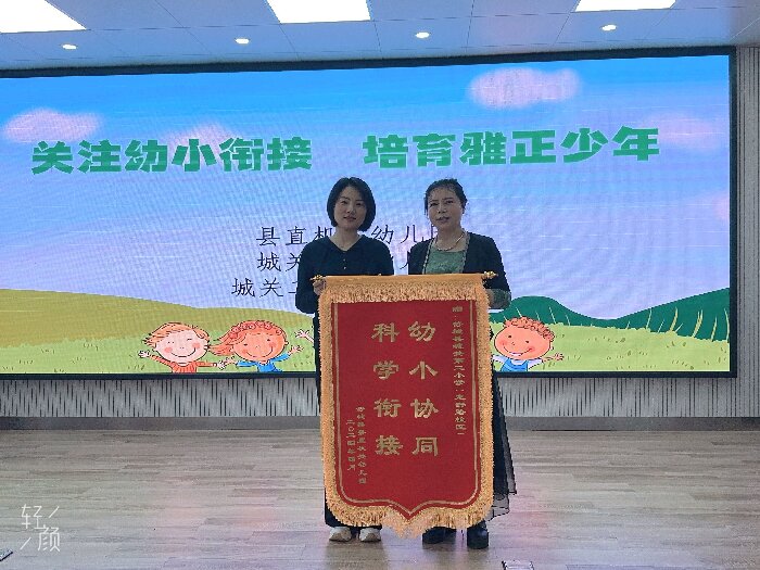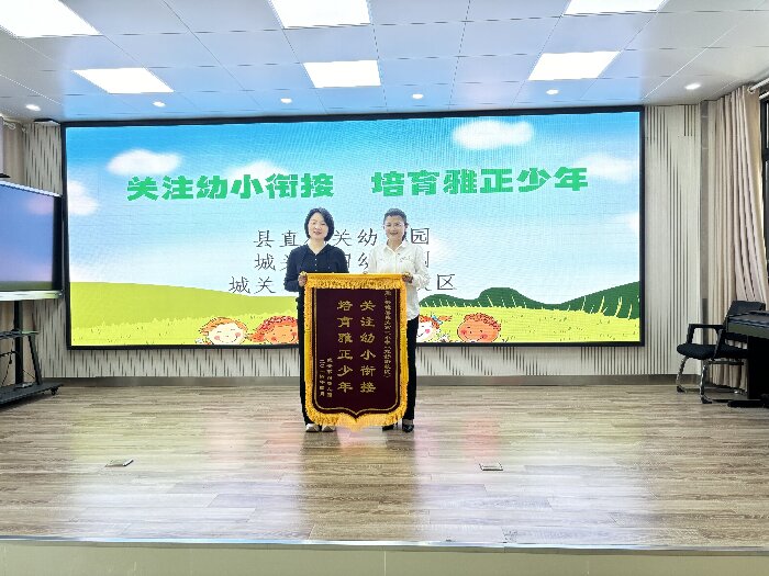 接着是观看大课间操、活力操,动感美妙的音乐响彻校园,活力四射的课间操精彩绽放……小朋友们也情不自禁地舞动起来。然后孩子们以“小学生”的身份到一年级各班体验小学课堂,感受互动课堂的魅力。他们认真听讲、积极讨论、踊跃发言,用心感受小学课堂的新奇与有趣。最后,孩子们有序地参观了各功能室,对小学的学习环境有了初步认识。活动最后,县直机关幼儿园园长金丽、城关第四幼儿园园长胡金梅分别给龙舒路校区赠送绣有“关注幼小衔接 培育雅正少年”“幼小协同 科学衔接”的锦旗,杜成蹊校长接过锦旗,并代表全校表示深深的感谢。