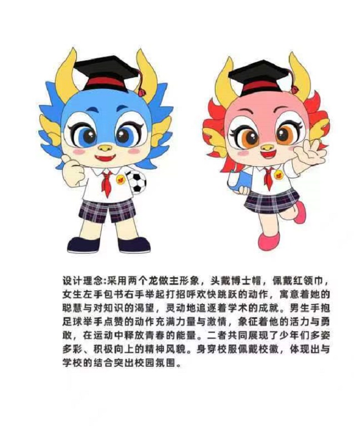 学校美术组7月10日宣传发动,得到了全校师生和家长的积极响应,截止8月10日共收到学生作品130幅,家长和教师作品32幅。经学校美术组教师认真评判,来自三年级董明轩的作品“龙龙”评定为特等奖,拟被学校采用。暑假期间,高温炎热,学校美术组教师和董明轩同学及家长,多次查阅资料,研讨改进和完善作品,活脱脱的可爱的龙的形象最终确定。设计组们把一男一女“龙龙”易名为“花花”和“桥桥”。“花花”手拿课本满脸欢喜,“桥桥”怀抱足球热爱运动。