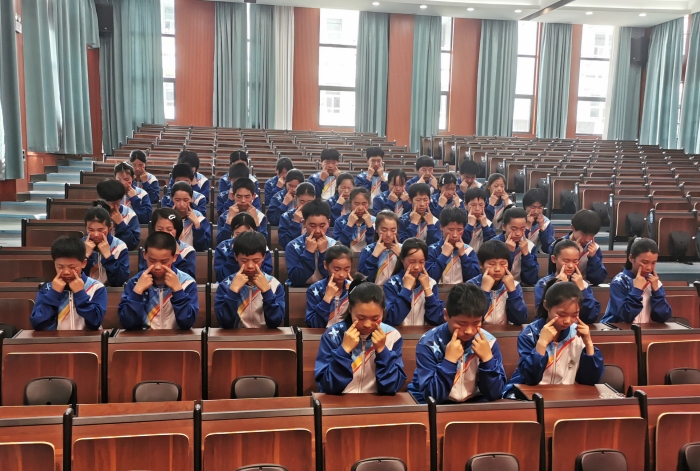 比赛前,各班学生认真练习眼保健操动作和护眼知识。全校学生按班级分组,通过抽签确定比赛顺序和同时参赛班级。比赛时,各班学生跟随音乐认真做好眼保健操,评委老师现场评分,鼓励学生改编或设计护眼操,融入乡土文化元素,让眼保健操成为学生的乐做项目。最后,四年级和七(1)班学生分别获得小学组和中学组一等奖。