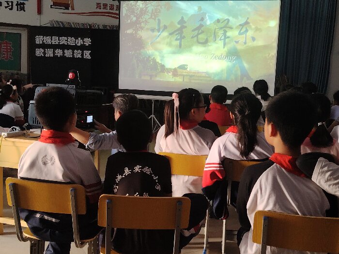 紧接着,爱国主义教育影片《少年毛泽东》登场。影片以少年毛泽东的成长为主线,展现了他在艰苦环境中,依然坚持勤奋求学,心系家国命运,立志报国的伟大情怀。细腻的叙事手法,将少年毛泽东的形象鲜活地展现在同学们面前。观影过程中,教室里安静极了,同学们全神贯注,眼睛紧紧盯着屏幕。当看到少年毛泽东克服重重困难求学时,不少同学眼中满是敬佩与感动。五年级学生代表江礼希观影后激动地说:“我们要像少年毛泽东一样,努力学习,成为对国家有用的人。”