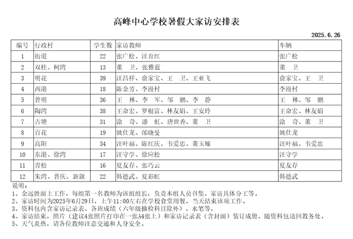 此次全员家访活动,不仅拉近了学校与家庭、教师与家长之间的距离,更将学校的关怀、老师的指导、安全的叮咛送到了千家万户,为学生的健康成长筑起了一道坚实的屏障。炎炎夏日,老师们送去的不仅是一次家访,更是一份清凉的关爱与深切的期望。高峰中心学校将持续推进家校共育工作,不断探索创新家访形式和内容,为学生的健康成长和全面发展创造更加良好的环境。相信在家校的共同努力下,高峰中心学校的学子们一定能够茁壮成长,实现自己的梦想。(特约通讯员:汪叶福)