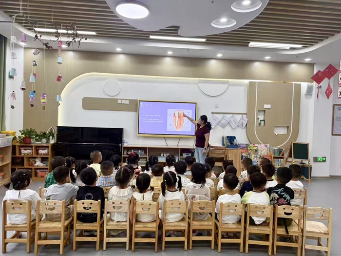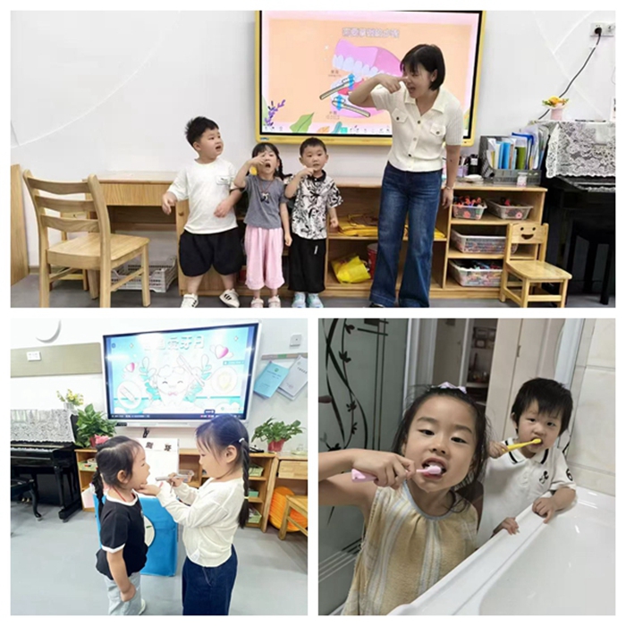 托、小班的老师们通过绘本故事、趣味动画,为孩子们带来了一次沉浸式的爱牙主题教育活动。中班则聚焦“学刷牙”实操教学,将日常活动变成了有趣的“护齿小课堂”。大班的活动围绕“坚持早晚刷牙”展开,老师通过情景讨论、制定“刷牙打卡表”等形式,引导孩子们养成早晚刷牙、爱护牙齿的好习惯,让护齿意识真正融入日常生活。