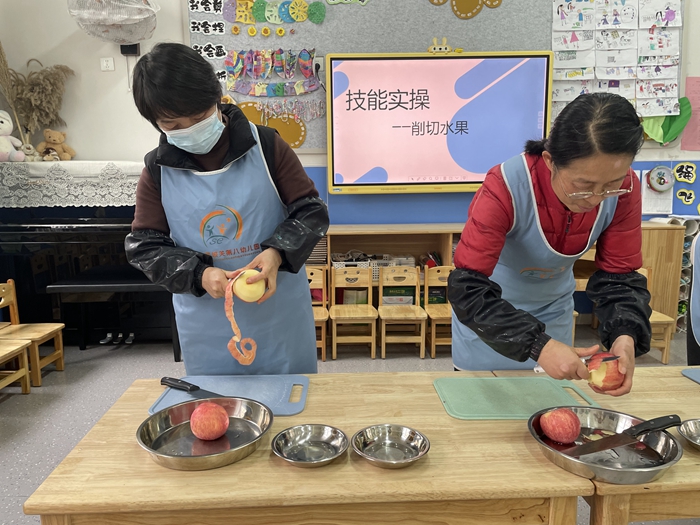 本次大赛设置知识抢答、桌面消毒、削切水果三大环节。知识抢答涵盖卫生保健、食品安全、政策法规等内容,保育员们反应迅速、对答精准;桌面消毒环节,选手严格遵循“清洁—消毒—再清洁”操作流程,规范配比消毒液,细致操作尽显专业;削切水果环节,大家按步骤削皮、去核、切块,兼顾卫生与幼儿饮食安全。评委组从操作规范、细节把控等方面公平打分,赛后还针对实操细节进行专业指导。