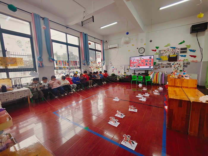 活动伊始,各班老师化身“新年知识小讲师”,通过生动讲解,向孩子们介绍元旦的由来。老师们还结合马年主题,讲述了与马相关的趣味故事,告诉孩子们马象征着奔腾向前、积极向上的精神,为整场活动增添了满满的文化气息。随后,各班级的特色活动轮番登场,热闹非凡。小、中班的教室里,宝贝们化身“小小手工家”,一只只憨态可掬的小马作品新鲜出炉,每一件都承载着孩子们对新年的美好期许。大班的活动更是别出心裁,一场热闹非凡的“手工赛马大会”精彩上演。赛前,孩子们早已发挥奇思妙想,用筷子、卡纸、彩绳等材料,制作出了属于自己的“专属小马”。比赛时,孩子们手持自己的作品,在教室里“策马奔腾”。这场充满创意的比赛,不仅锻炼了孩子们的动手能力,更点燃了大家的竞争热情与合作意识。