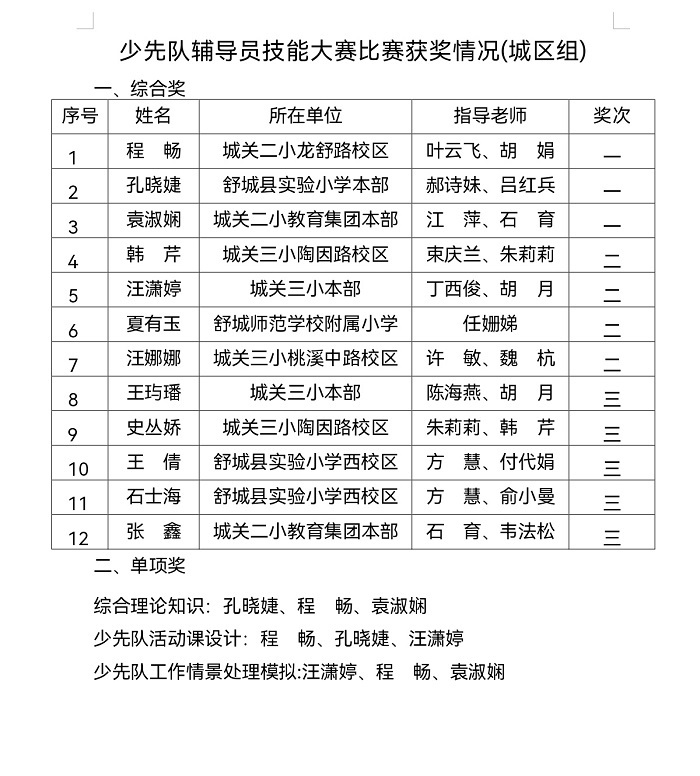 城关二小教育集团龙舒路校区谢莉莉、程畅老师在县级少先队竞赛中双双摘桂