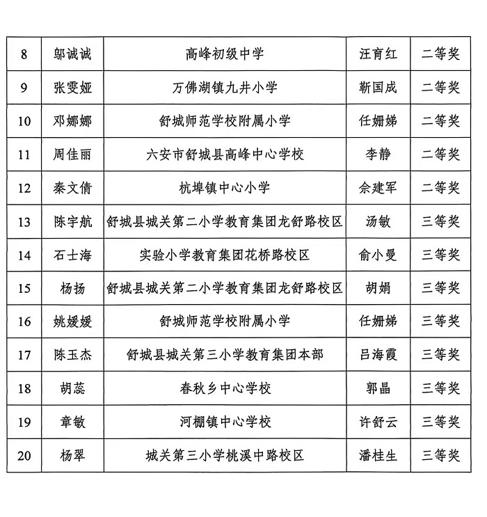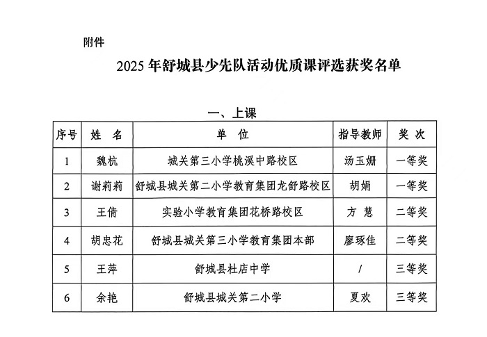 近日,舒城县2025年度少先队工作两项重要赛事结果揭晓,城关二小教育集团龙舒路校区教师表现卓越,捷报频传。在2025年舒城县少先队活动优质课评选中,谢莉莉老师荣获上课类一等奖,陈宇航、杨扬老师获说课类三等奖。在由共青团舒城县委、舒城县教育局、少先队舒城县工作委员会联合主办的2025年舒城县少先队辅导员技能大赛中,程畅老师荣获城区组综合一等奖。几位老师为学校赢得了崇高荣誉,充分彰显了龙舒路校区少先队辅导员队伍过硬的专业素养和强大的育人实力。
