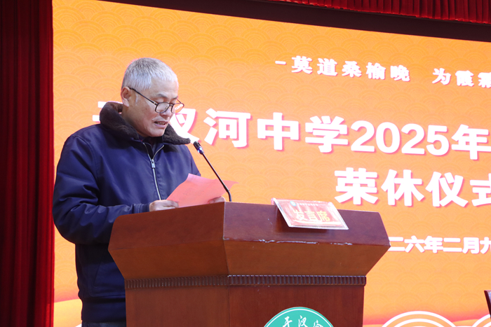 校工会主席王明红宣读了退休文件及退休教师名单。校党总支副书记、校长陈勇代表学校致辞。他深情回顾9位老师多年来在各自岗位上默默奉献、辛勤耕耘的感人点滴,赞扬他们以高尚师德、精湛业务与深厚情怀,为学校发展和学生成长倾注了全部心血与热忱。他代表全校师生向荣休教师致以诚挚感谢与崇高敬意,恳请退休教师常回家看看,为年轻教师现身说法、传授经验,为学校发展传经送宝、建言献策,并衷心祝愿他们退休生活多姿多彩、幸福安康。