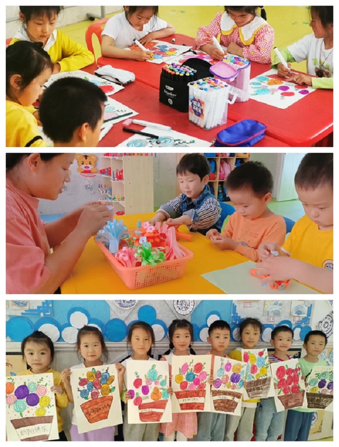 各班老师组织了不同形式的活动,让幼儿来表达对母亲的感恩之情。如:大班通过绘画的形式,让幼儿画一幅画送给自己的妈妈;中班幼儿给妈妈制作了一张精美的贺卡;小班小朋友用卡纸给妈妈做了一朵漂亮的小花。各班级老师还组织幼儿对妈妈说上一句最贴心的话,来表达孩子们对妈妈的爱。
