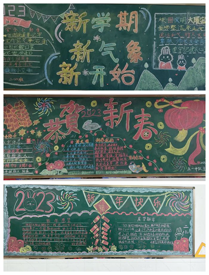 本次创作黑板报内容丰富:有表现学生的“新年愿望”,表达出“新年的祝福”;有文明礼仪宣传——暖心的“文明小贴士”;有校园安全教育,将怎样珍爱生命、保护健康时时提醒。