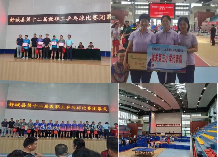 7月28日至8月1日,第十二届县教育系统职工乒乓球比赛在舒城职业学校举行。来自全县教育系统28个单位,男女共38支代表队参加了团体赛的争夺,近150名运动员参与男女单打的角逐。 城关三小教育集团关工委选派了3名男队员和4名女队员参加了团体赛,队员们在比赛中发挥出色,男女队皆获得团体赛第四名。