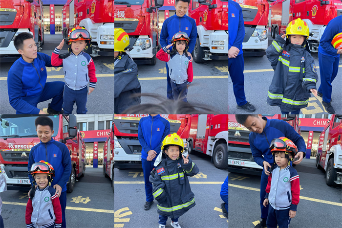 来到消防队之后,消防员叔叔热情的带领孩子们参观了他们的寝室、洗漱间、健身房、娱乐室。随后,为孩子们详细介绍了各种各样的消防装备和消防救生器材,孩子们认识了消防手套、消防服装、防毒面具、切割机等器械设备,同时也了解这些器材的操作方式和用途。最后,孩子们在消防员叔叔的指导和保护下,穿上了消防服,戴上了消防帽,坐上了消防车,真正体验了一把当“消防员”的感觉。消防队体验之旅很快就结束了,孩子们纷纷与消防员叔叔们合影留念。回到幼儿园后,孩子们用画笔和画纸将今天在消防队的所见所闻记录了下来,并进行了分享和交流。