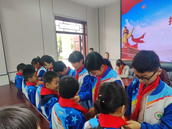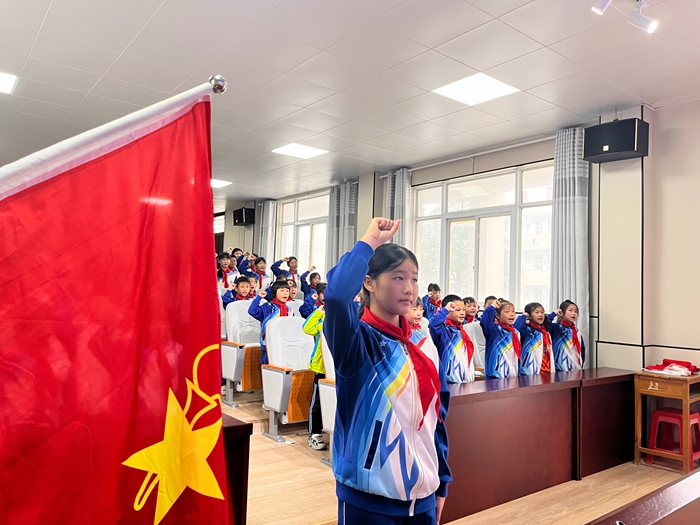 在激昂的《出旗曲》中,护旗手高举少先队队旗步入会场,随后,全体少先队员齐唱《中国少年先锋队队歌》,展现了新时代少先队员朝气蓬勃、积极向上的精神风貌;学校大队辅导员宣读了新队员名单,老队员们为他们佩戴红领巾,大队长带领全体新队员面向队旗庄严宣誓,激励着每一位少先队员不忘初心,牢记使命,为祖国的繁荣富强贡献自己的力量。