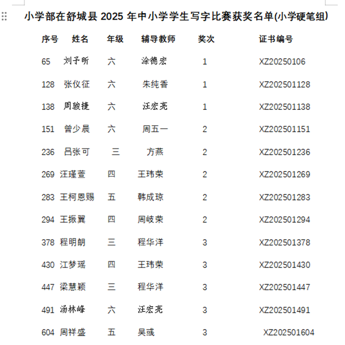 近日,舒城县2025年“新华杯”中小学学生写字比赛结果揭晓,张母桥镇中心校小学部与初中部学子凭借扎实的书写功底和良好的艺术素养,在比赛中脱颖而出,斩获多项荣誉,为学校争光添彩。
