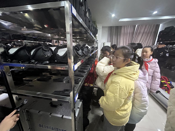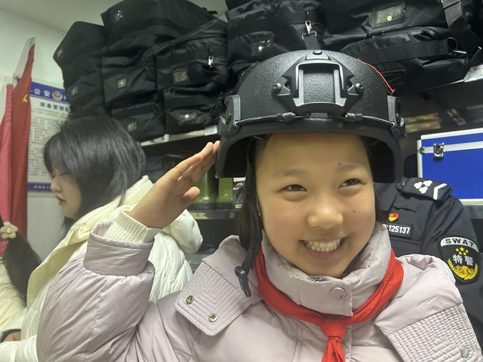 随后,队员们来到警务装备展示区,盾牌、匕首、各式手枪等装备整齐陈列,瞬间吸引了队员们的目光。民警叔叔耐心讲解每一件装备的用途和使用方法,大家好奇地驻足观看,时不时发出惊叹声。不少小队员还试戴警帽,过了一把“小警官”的瘾。